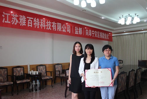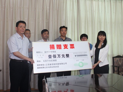 (雅百特向鹽都區(qū)慈善會(huì)捐款100萬(wàn)元)