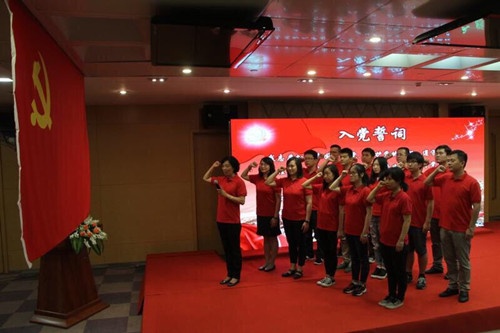 (新黨員在黨旗下舉起右拳,莊嚴(yán)宣誓,表達(dá)為共產(chǎn)主義奮斗終身的決心)