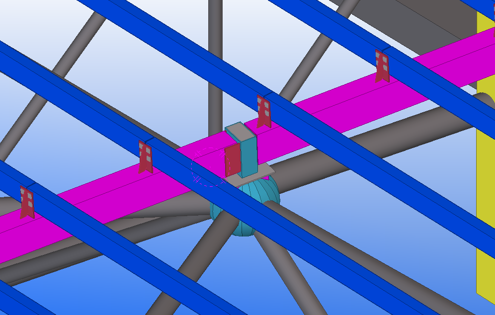 漸變的曲面屋頂是項(xiàng)目的亮點(diǎn),也是項(xiàng)目的難點(diǎn)之一。在深化設(shè)計(jì)階段,項(xiàng)目部先采用BIM技術(shù)進(jìn)行三維空間模擬,用Rhino+Grasshopper參數(shù)化依次確定主次檁條的空間樣條曲線(xiàn),依據(jù)順滑的樣條曲線(xiàn)來(lái)實(shí)現(xiàn)3D實(shí)體的模擬,使用相關(guān)軟件結(jié)合設(shè)計(jì)圖紙進(jìn)行實(shí)體碰撞檢查,完成節(jié)點(diǎn)部位的3D設(shè)計(jì),檢查完成無(wú)誤后進(jìn)行出圖。